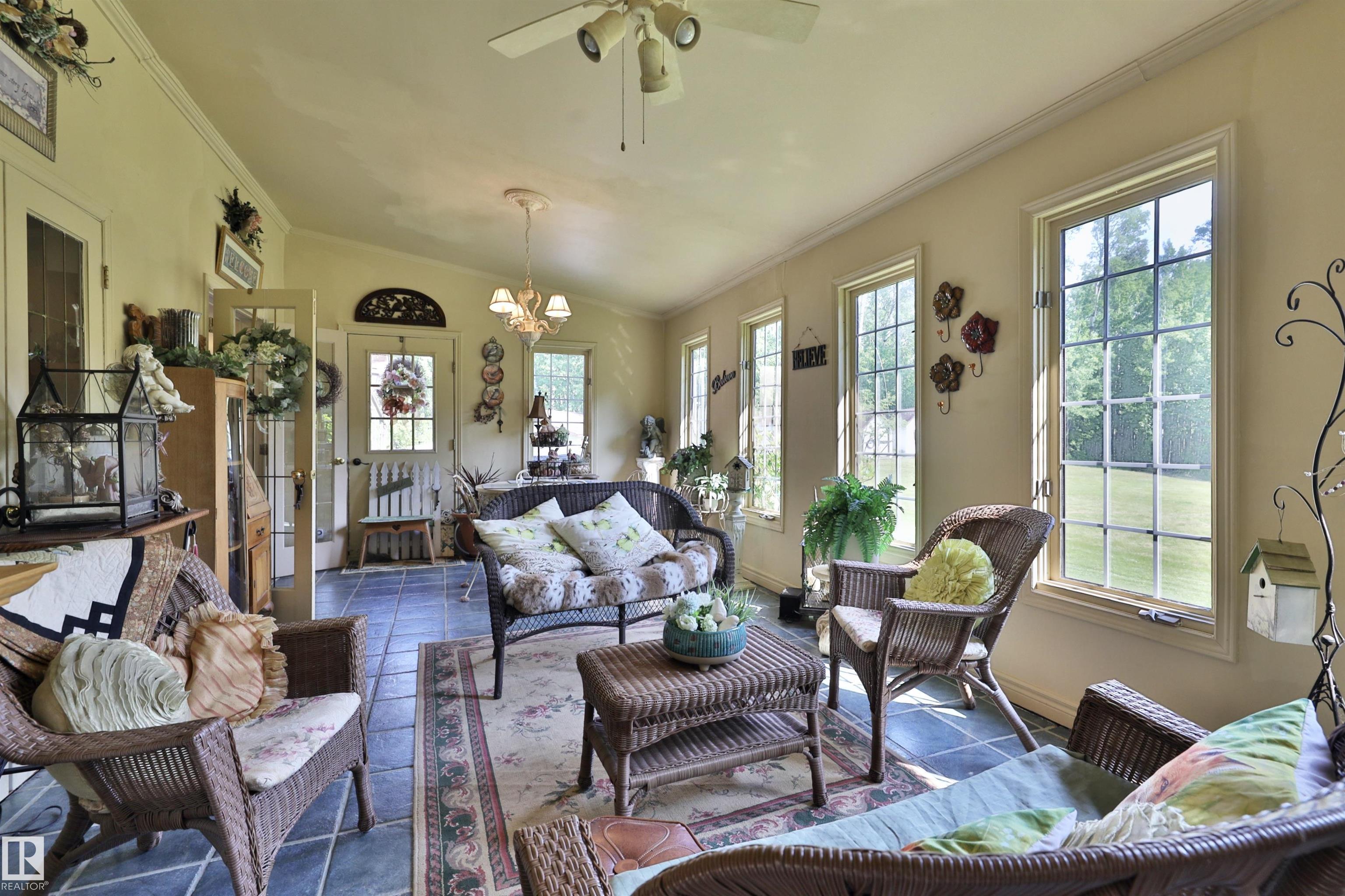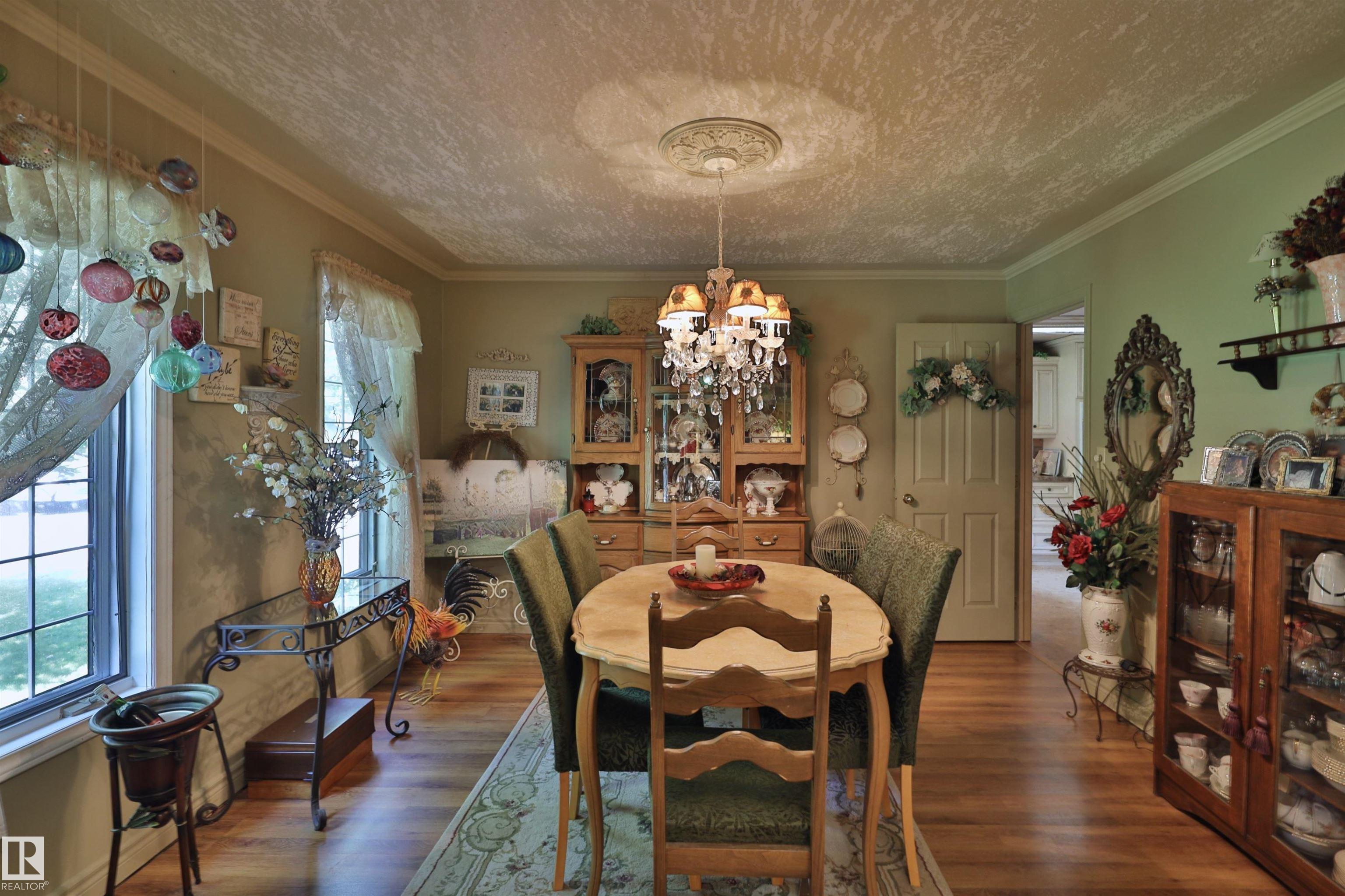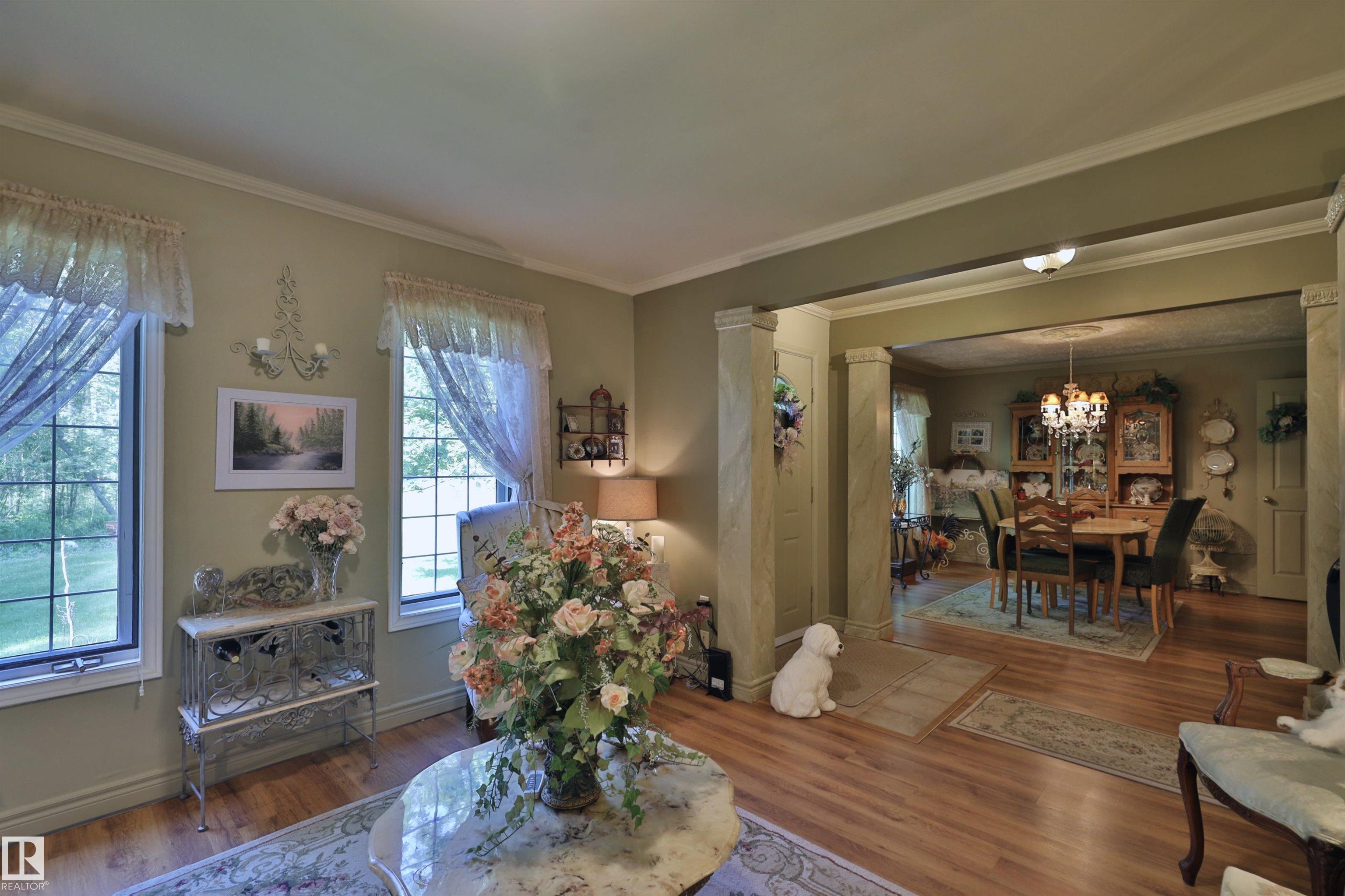 Stunning home for the growing family located on over 7 acres close to the north shore of Pigeon Lake. Beautifully landscaped with numerous perennials, boxed garden beds, a pond, a bridge to the private firepit area, 3 storage sheds, a detached garage and a green house. Inside this well maintained home, there are 4 bedrooms, and 3 bathrooms. The main floor offers a family room, a bright and inviting sun room, spacious kitchen, living room, formal dining room, the master bedroom and a 6 pce bathroom, and main floor laundry with a 2 pce bath. Upstairs there are 3 more bedrooms, a full bathroom, a play room, the bonus room and a wine making room. So much space to enjoy in this wonderful acreage property both inside and out. Prepare to be impressed.