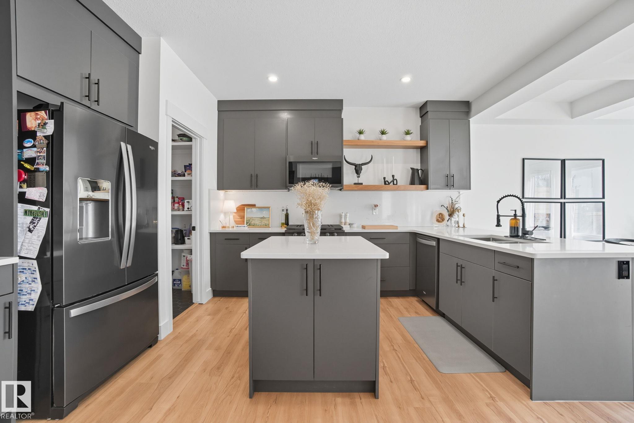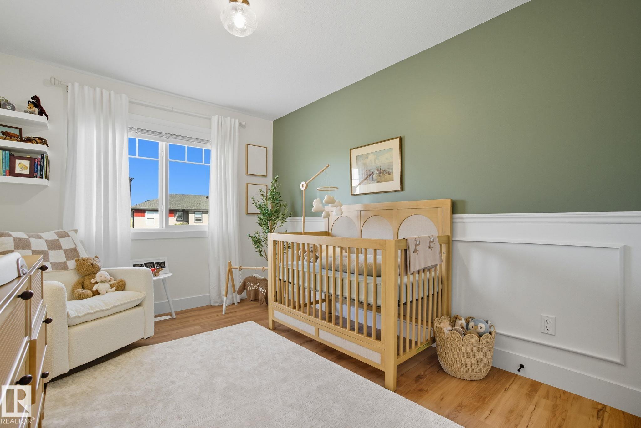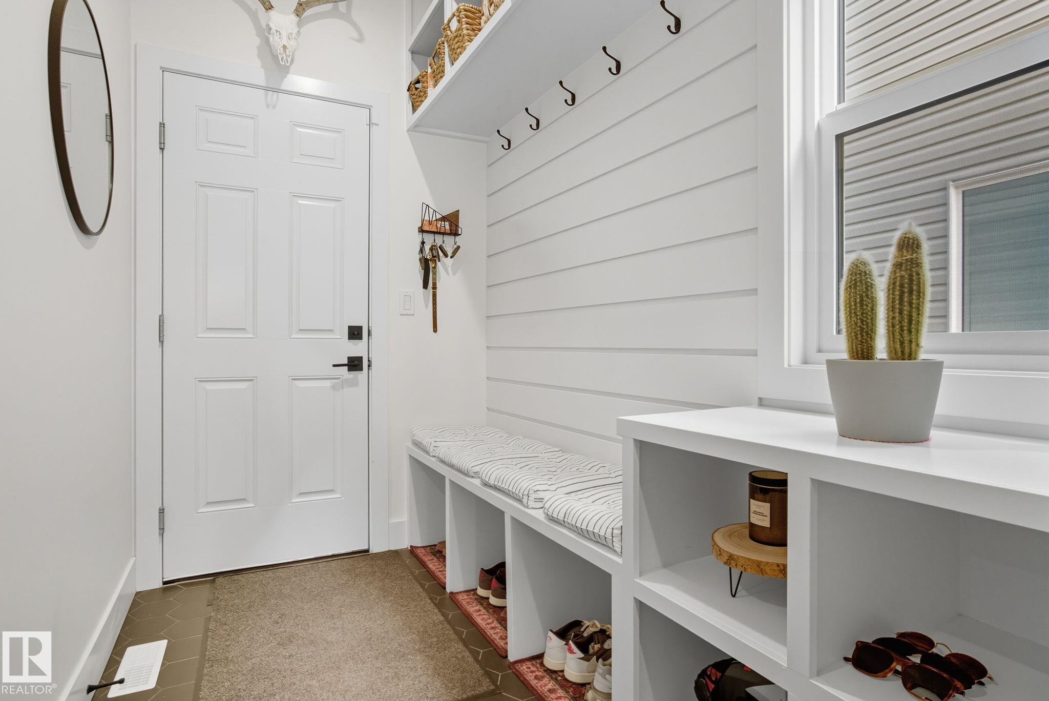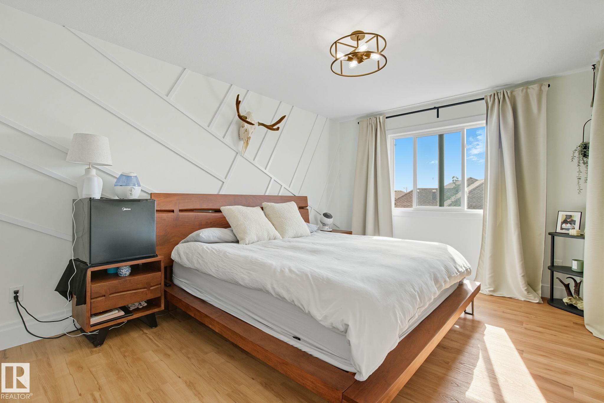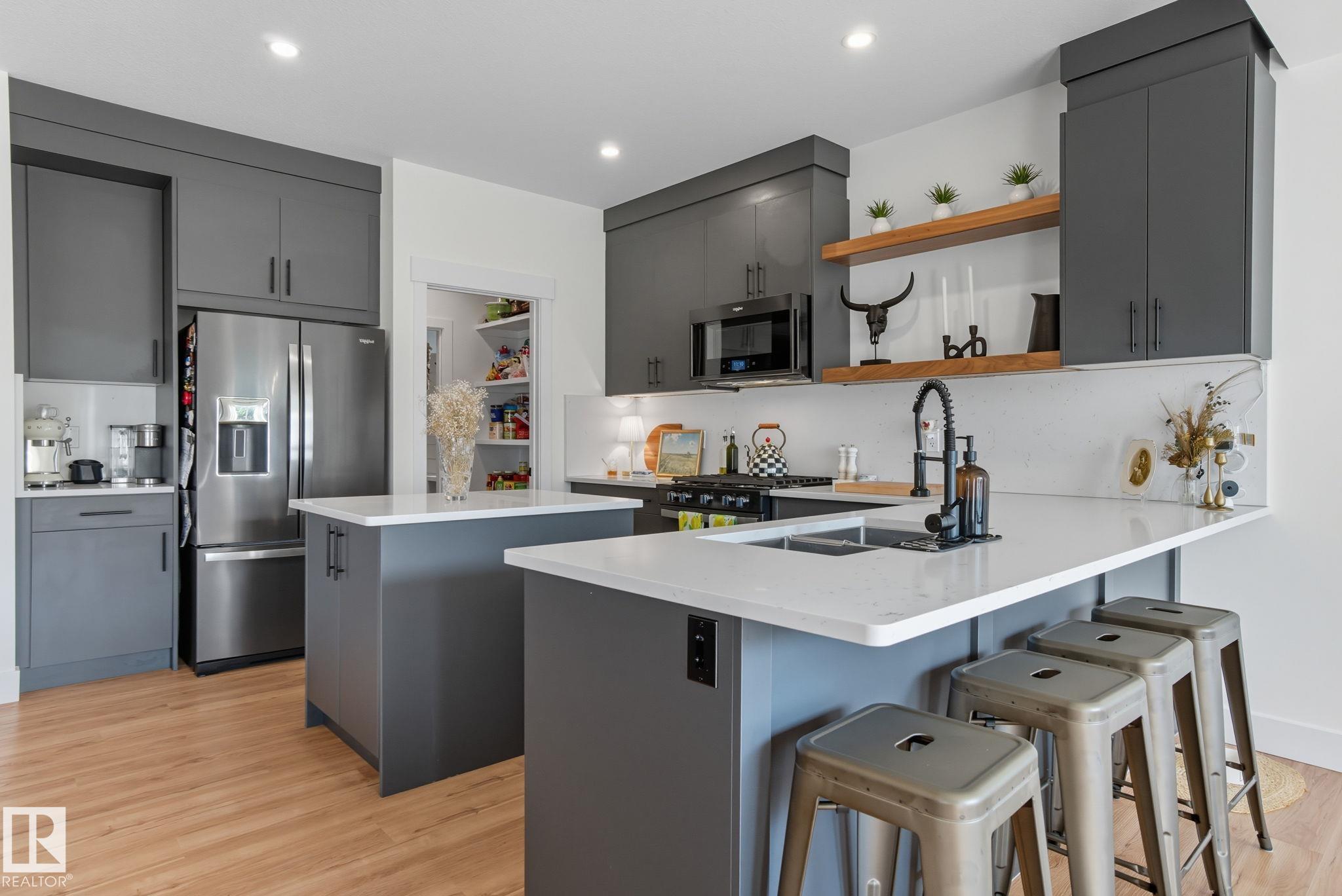 This property truly has it all. Nestled in a family-friendly community, surrounded by scenic walking trails where you can enjoy pond views from your very own balcony! Soaring 9' main floor ceilings, a chic tile fireplace with open display shelving, hard surface flooring throughout the entire home, and gorgeous iron railing create a luxurious feel. Thoughtfully designed mudroom with bench and shelving, seamlessly connects to the gourmet kitchen via walk-through pantry. The kitchen impresses with full height, soft-close cabinetry, gas stove, breakfast bar, and premium countertops & backsplash. Beautiful coffered ceiling creates a stylish dining area that leads to your outdoor oasis complete with BBQ gas line and concrete stamped patio. Enjoy all season comfort with heated garage (22'x19'), A/C, smart thermostat and triple pane windows. This home even has upstairs laundry room + side entrance for possible basement suite! Close to YEG airport and south Edmonton. Welcome to your peaceful retreat!