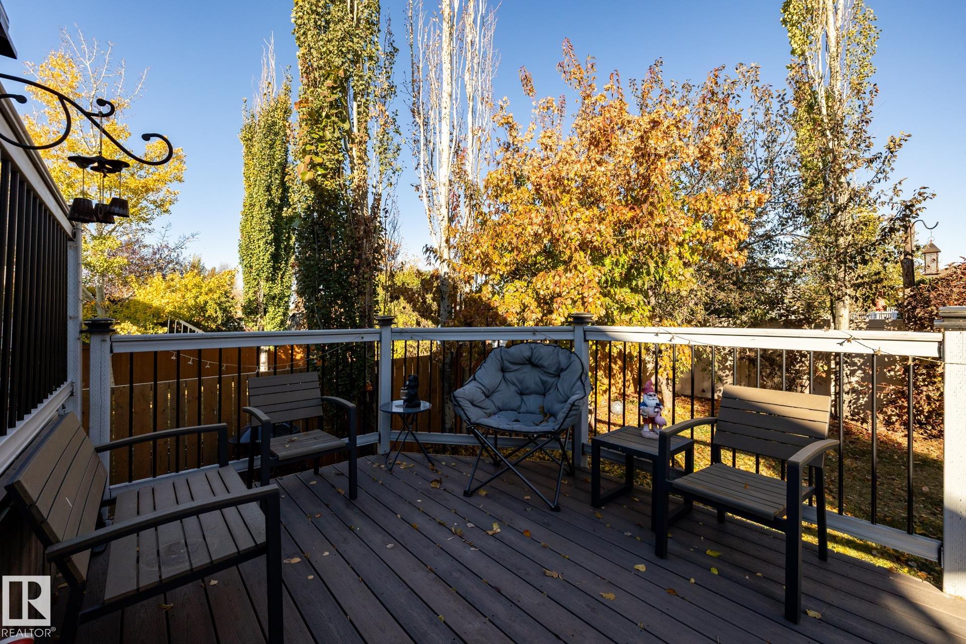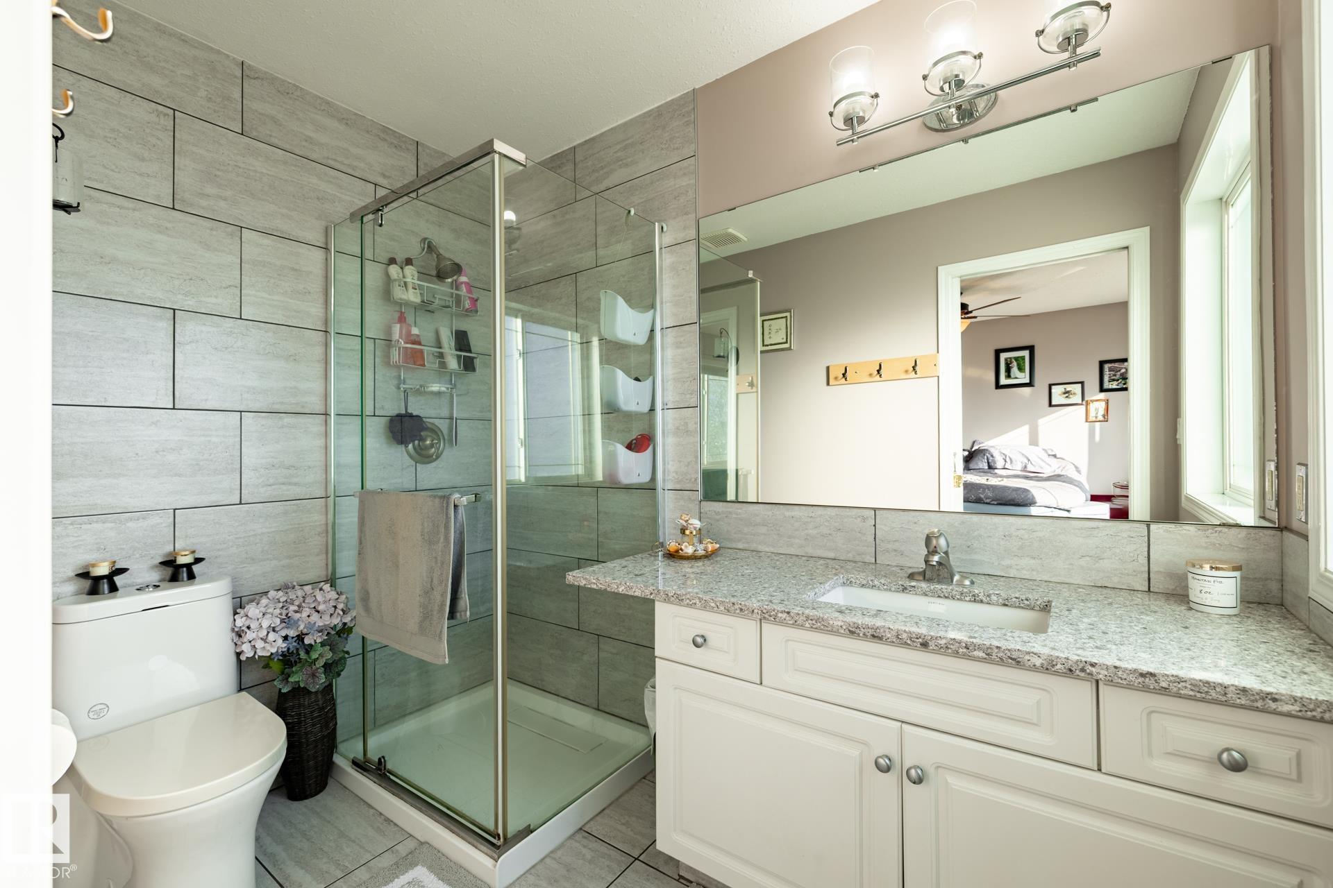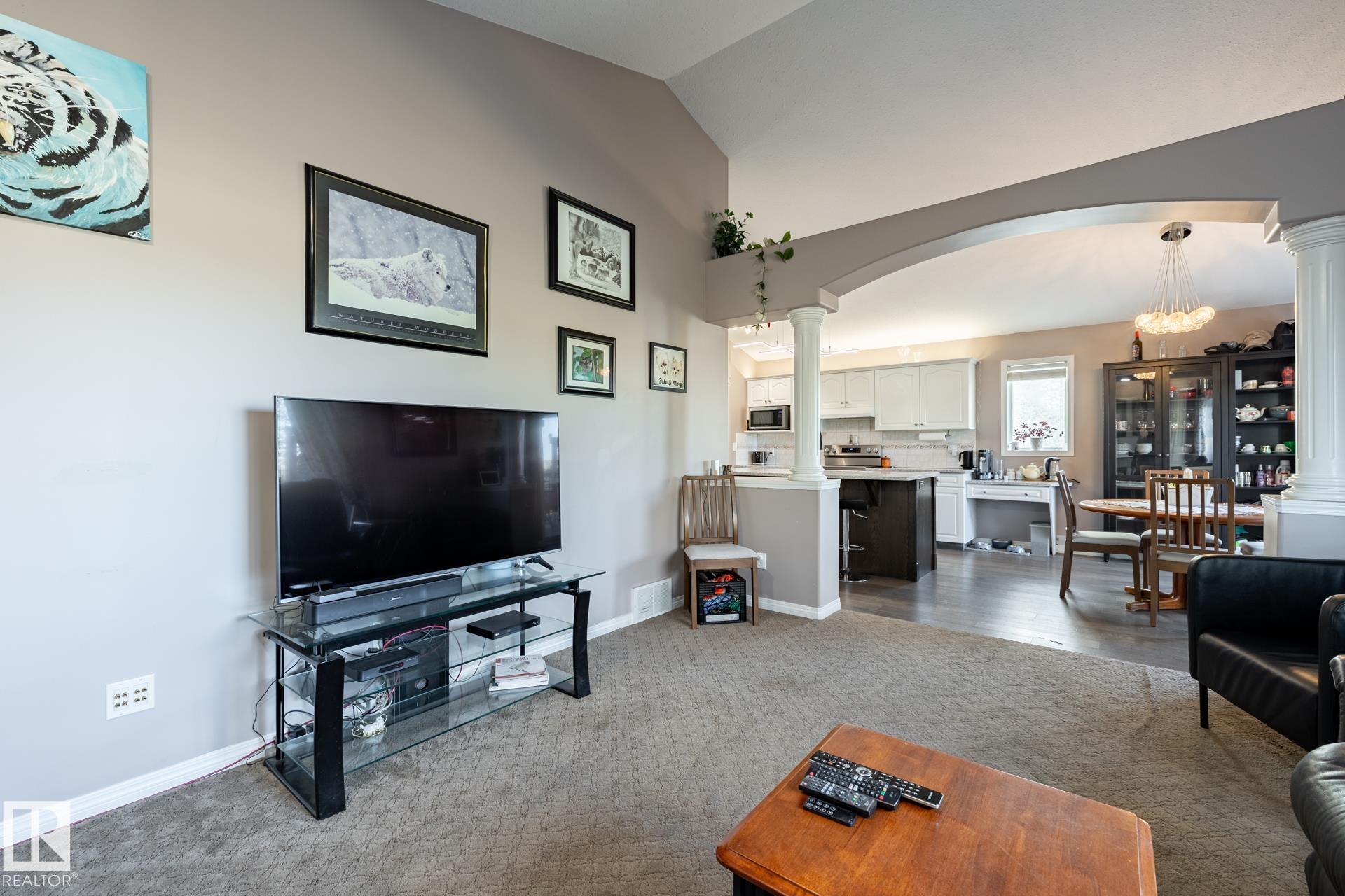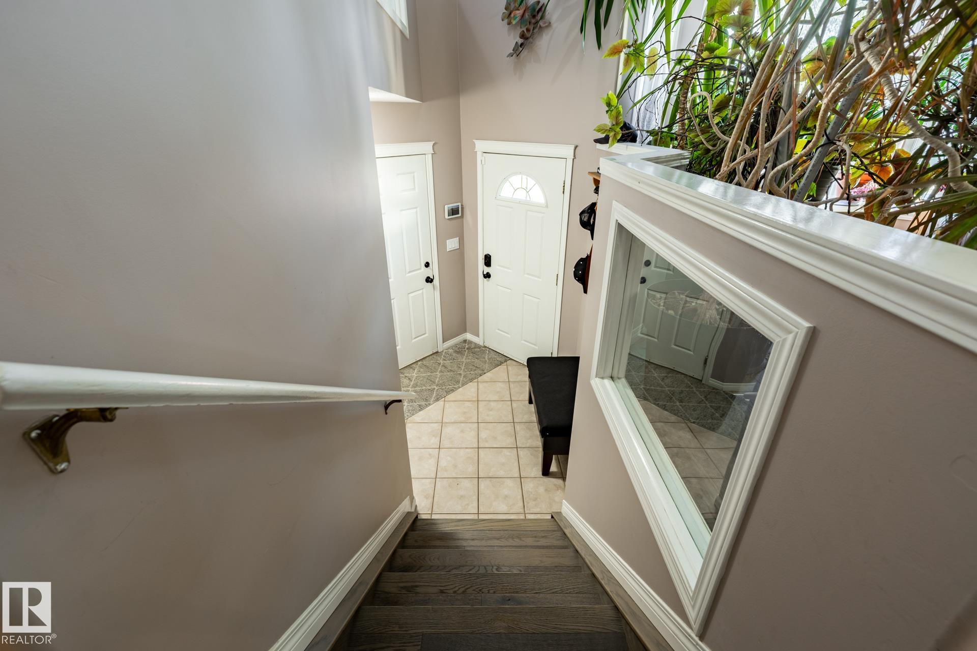Welcome to Deer Park, a desirable west-side Spruce Grove community offering quick access to HWY 16. This inviting, air-conditioned modified bi-level built in 2000 offers over 2500 sq ft of living space & a heated, 18'Wx21'L double attached garage. Main floor: vaulted living room, kitchen & dining area, cozy family room w/ gas fireplace, two bedrooms & 4-pc bath. The private primary suite above the garage includes a walk-in closet & 3-pc ensuite. The basement is super bright featuring a spacious recreation room, updated 3-pc bath, 4th bedroom, storage room, laundry room & flexible den that could easily become the 5th bedroom or hobby room. Updates: shingles, furnace, hot water tank, engineered hardwood, vinyl plank flooring, carpet, quartz countertops in kitchen, custom built 8ft island, updated kitchen cabinetry, blinds, electric stove, and dishwasher. Enjoy patio door access to the two-tiered deck w/ hot tub & private fenced yard with mature trees/landscaping. Move in ready!