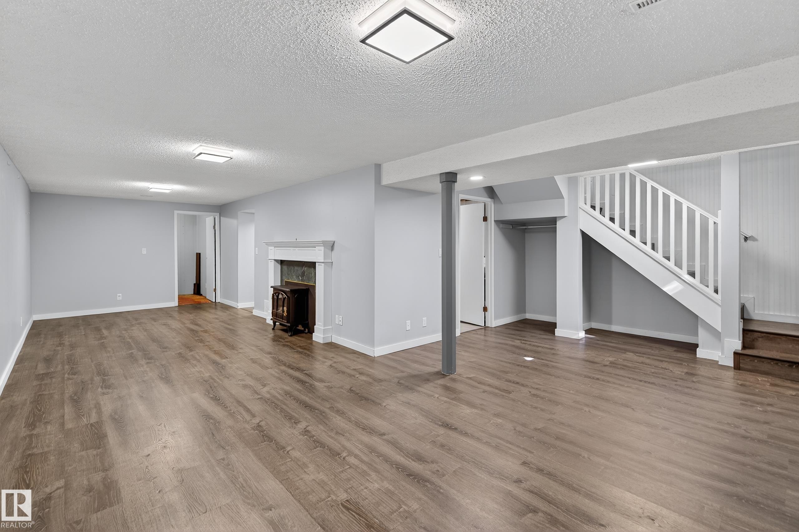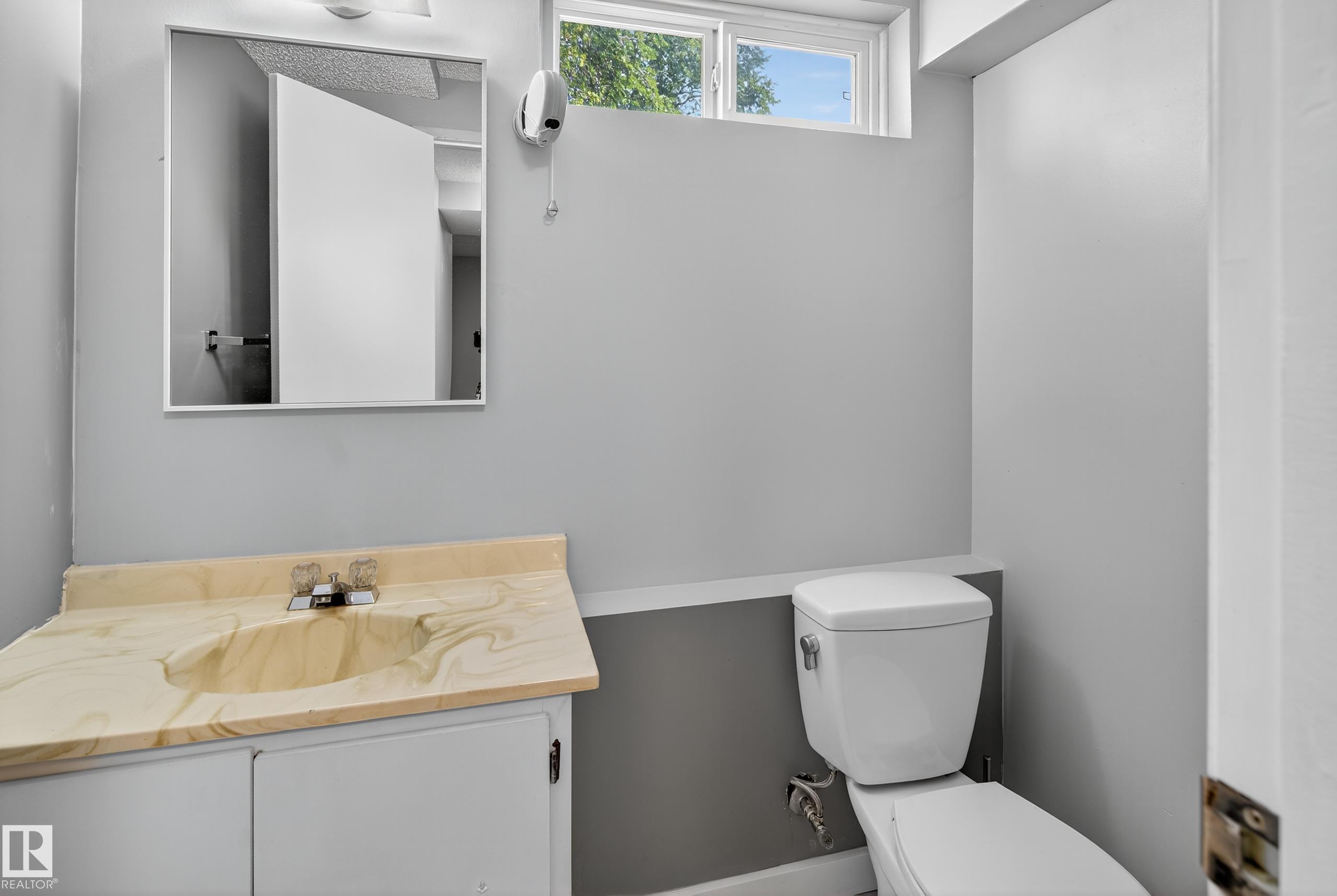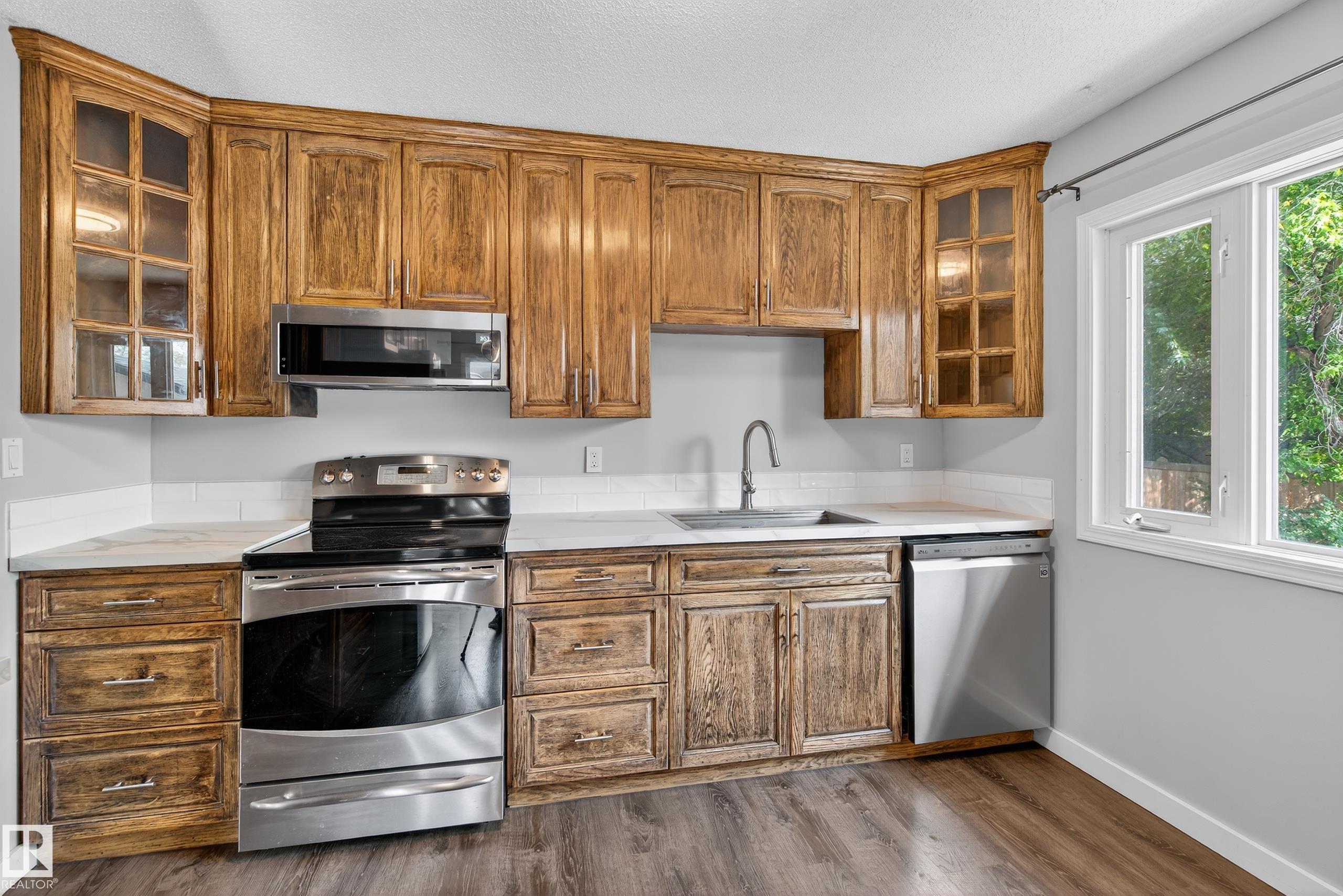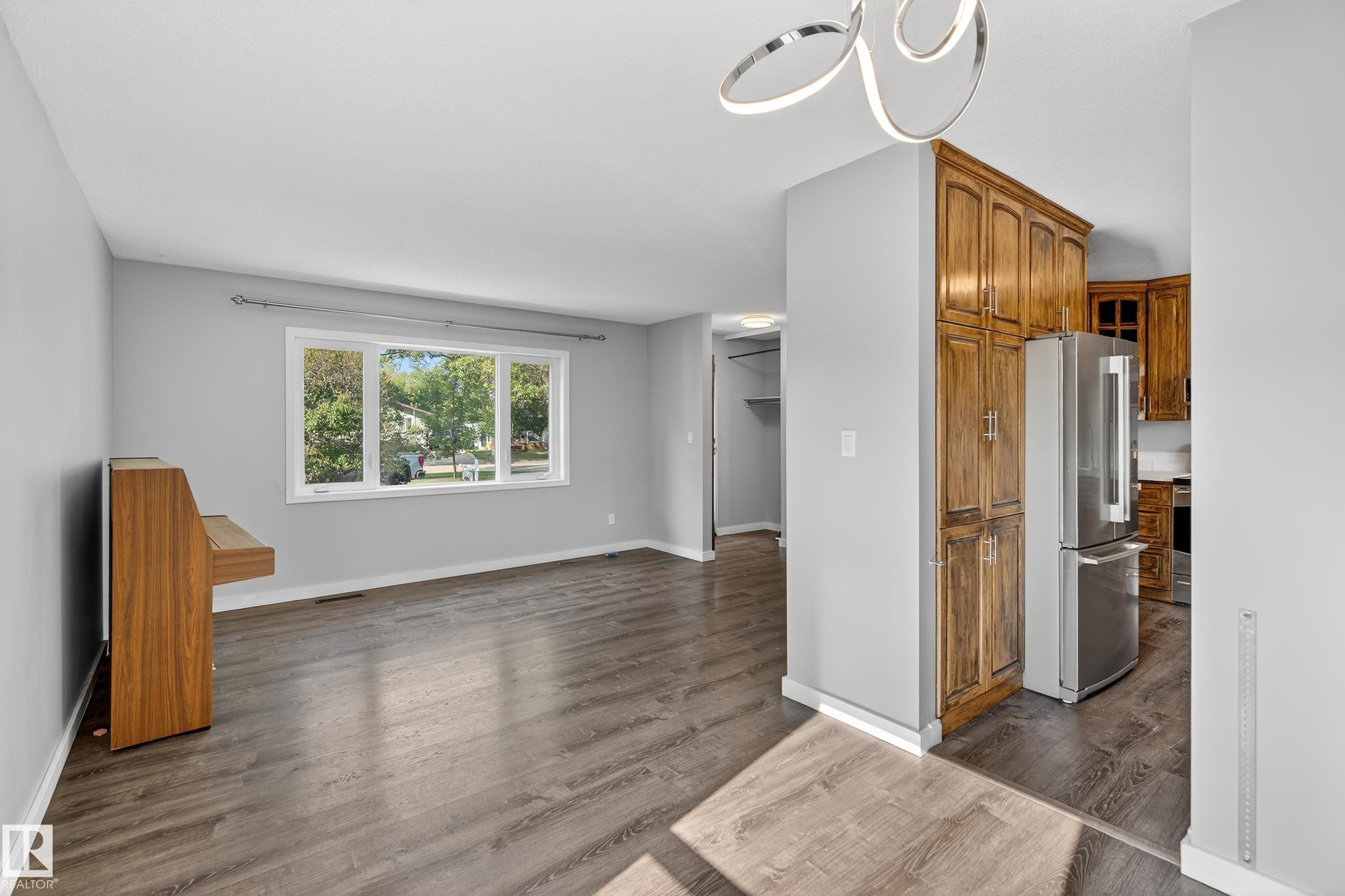 TURN-KEY home with incredible value! This beautifully updated bungalow BACKS ONTO GREENSPACE and a walking trail in the heart of Fort Saskatchewan. Located on a QUIET STREET with tons of street parking, this home offers peace and convenience. Recent upgrades include CENTRAL A/C, newer flooring, roof, windows, kitchen counters and sink, furnace, HWT, fence, eavestroughs, fascia, and more. The main floor features a bright, functional layout with a spacious living room, updated kitchen, 3 bedrooms, and a modern 4pc bath. The FULLY FINISHED BASEMENT offers a SEPARATE ENTRANCE for potential income suite development, a large rec room with electric fireplace, 4th bedroom, 2pc bath, and plenty of storage. Enjoy the HUGE BACKYARD with mature trees, a new shed, brand new DOG RUN, plus a HEATED, INSULATED OVERSIZED single garage and RV PARKING. Available for IMMEDIATE POSSESSION?this home is the perfect blend of updates, location, and flexibility!