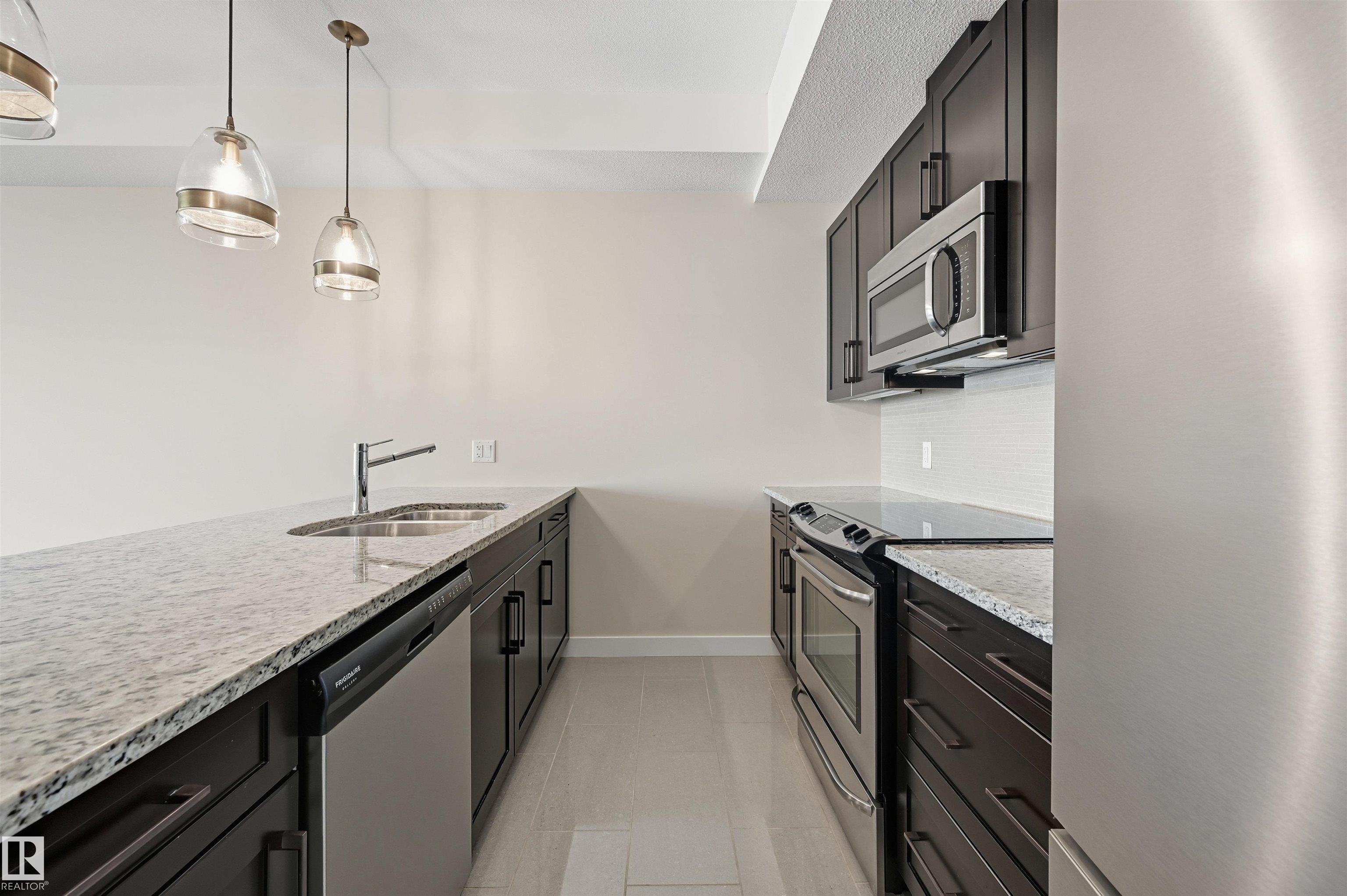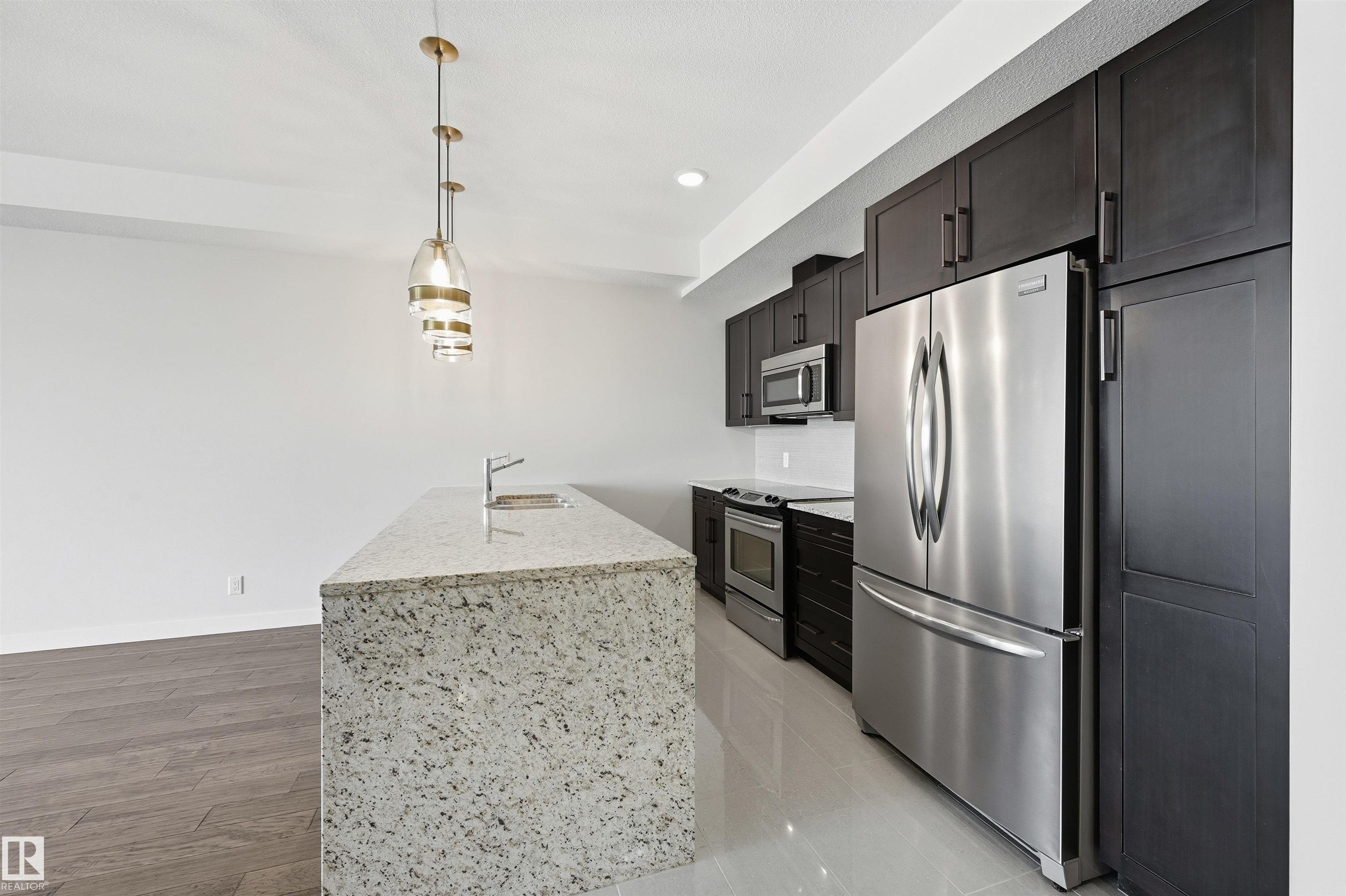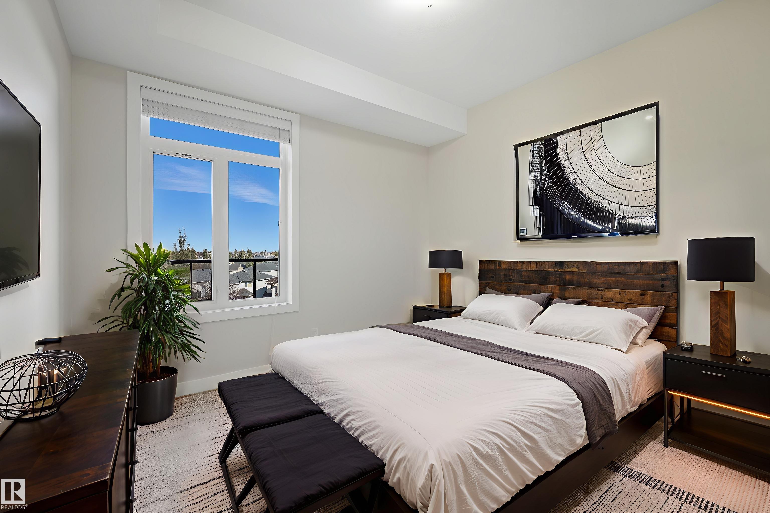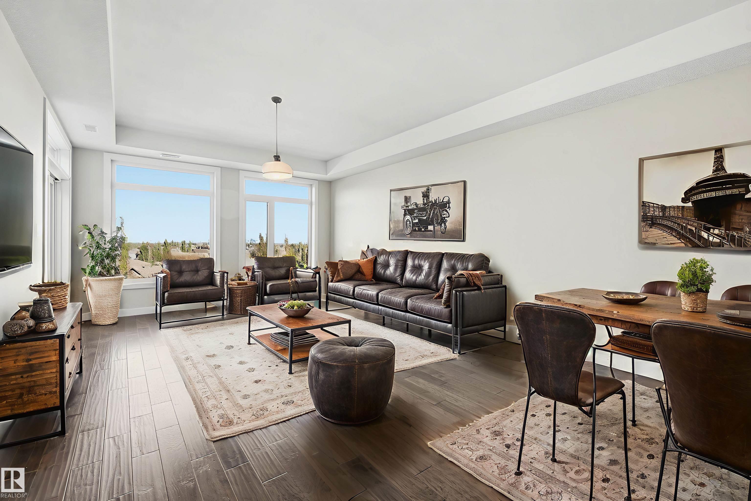 Experience luxury living at Brass III The Leger in the desirable Riverbend. This top-floor unit offers city views, showcasing craftsmanship & a well functioning floorplan. The bright, open layout features 9 ft ceilings, engineered hardwood, granite countertops, S/S appliances, maple shaker cabinets & an island w/eating bar. Living area will accommodate most furniture arrangements. Bedrooms are on opposite ends for privacy. The spacious primary suite includes a walk-in closet w/built-ins and a 4pc ensuite w/soaker tub & glass shower. 2nd bedroom for guest stays or home office/hobby studio. 3pc bathroom w/matching finishing palette. Enjoy the balcony for evening bbqs, central A/C, in-suite laundry. Double tandem underground parking stalls w/storage. Well managed complex w/healthy reserve fund. Pet-friendly & ideally located near Terwillegar Rec Centre, schools, parks & all servicing amenities. This residence combines elegance, comfort & convenience in one of Edmonton?s most sought-after communities.