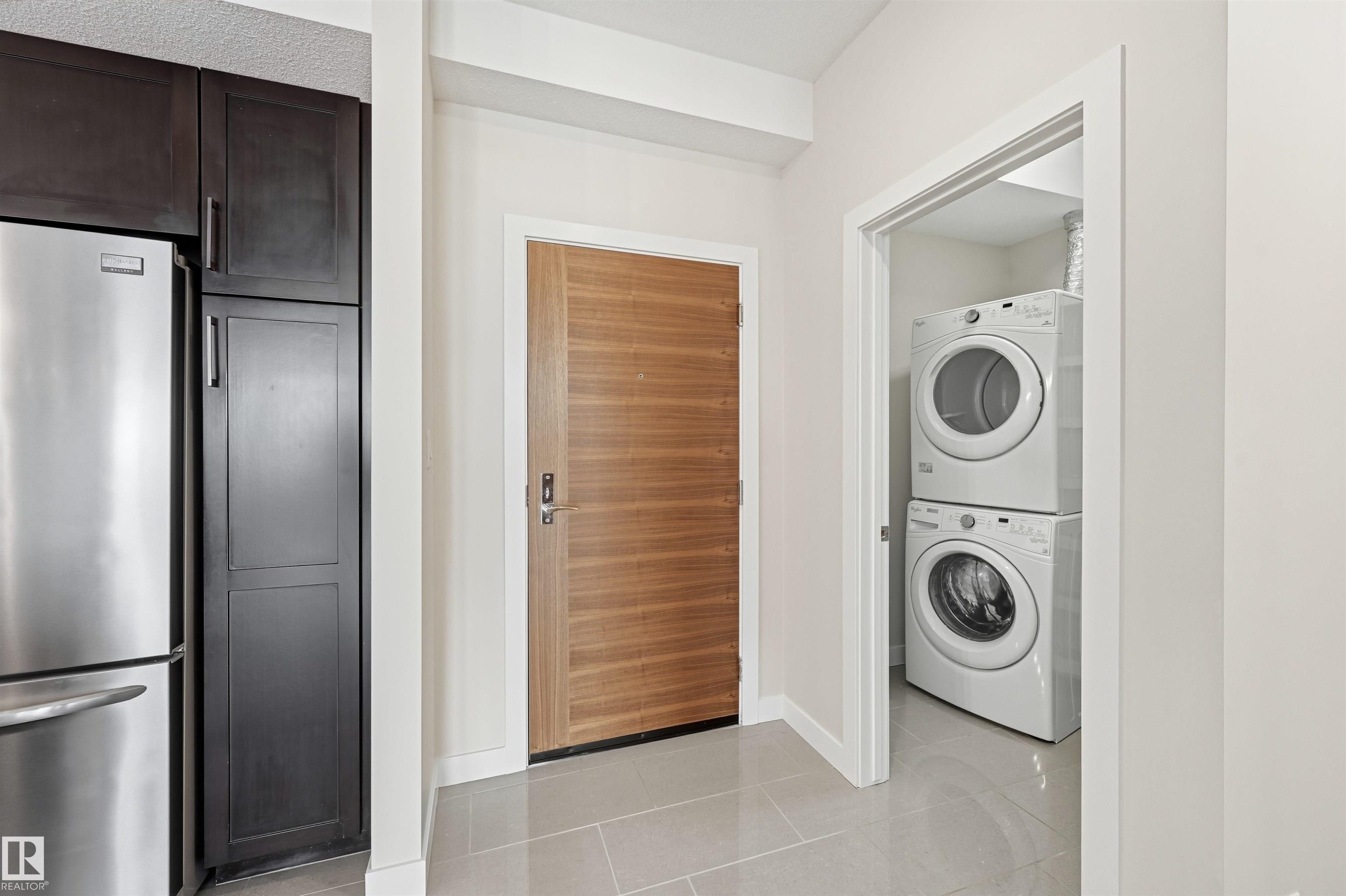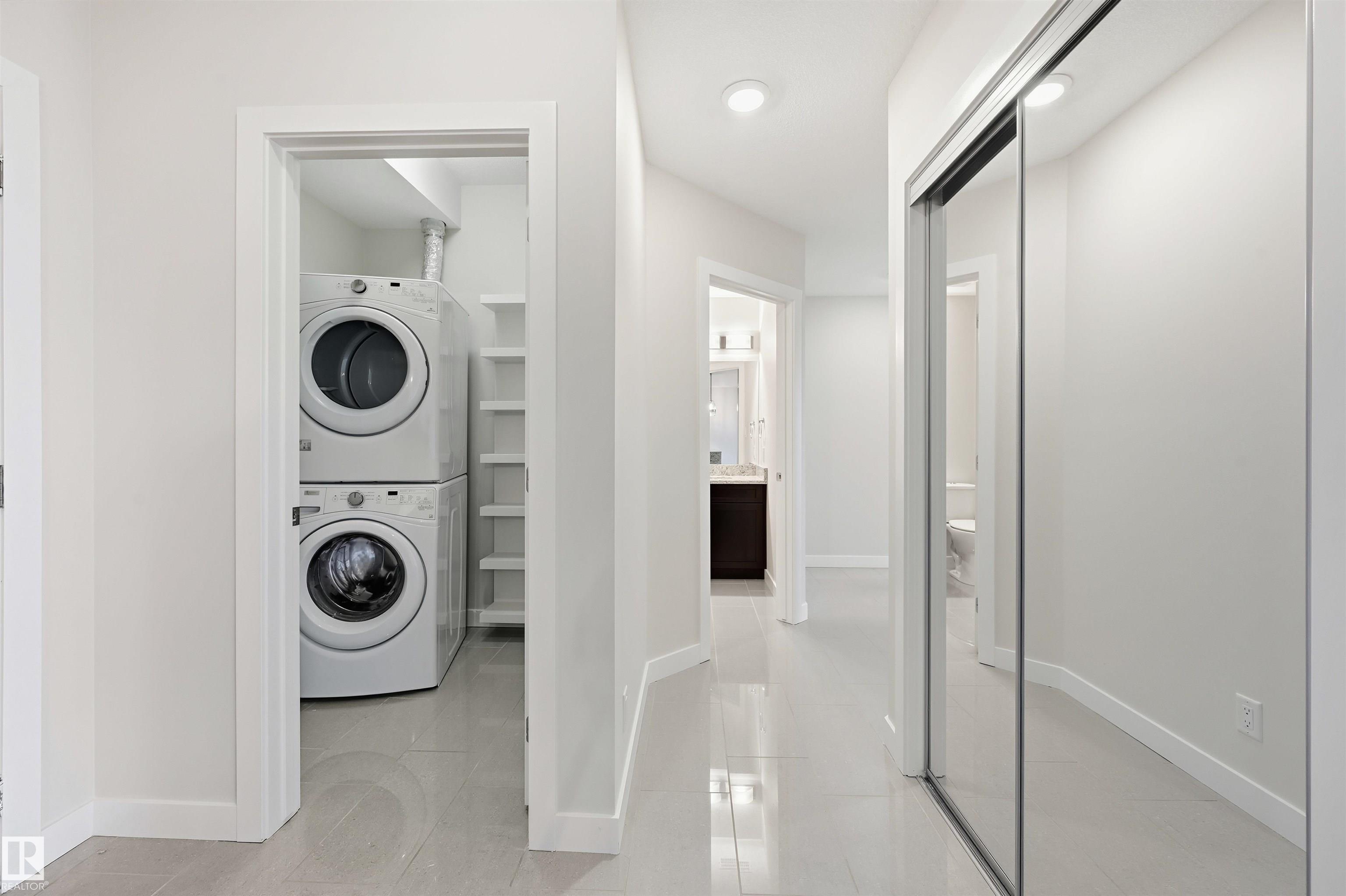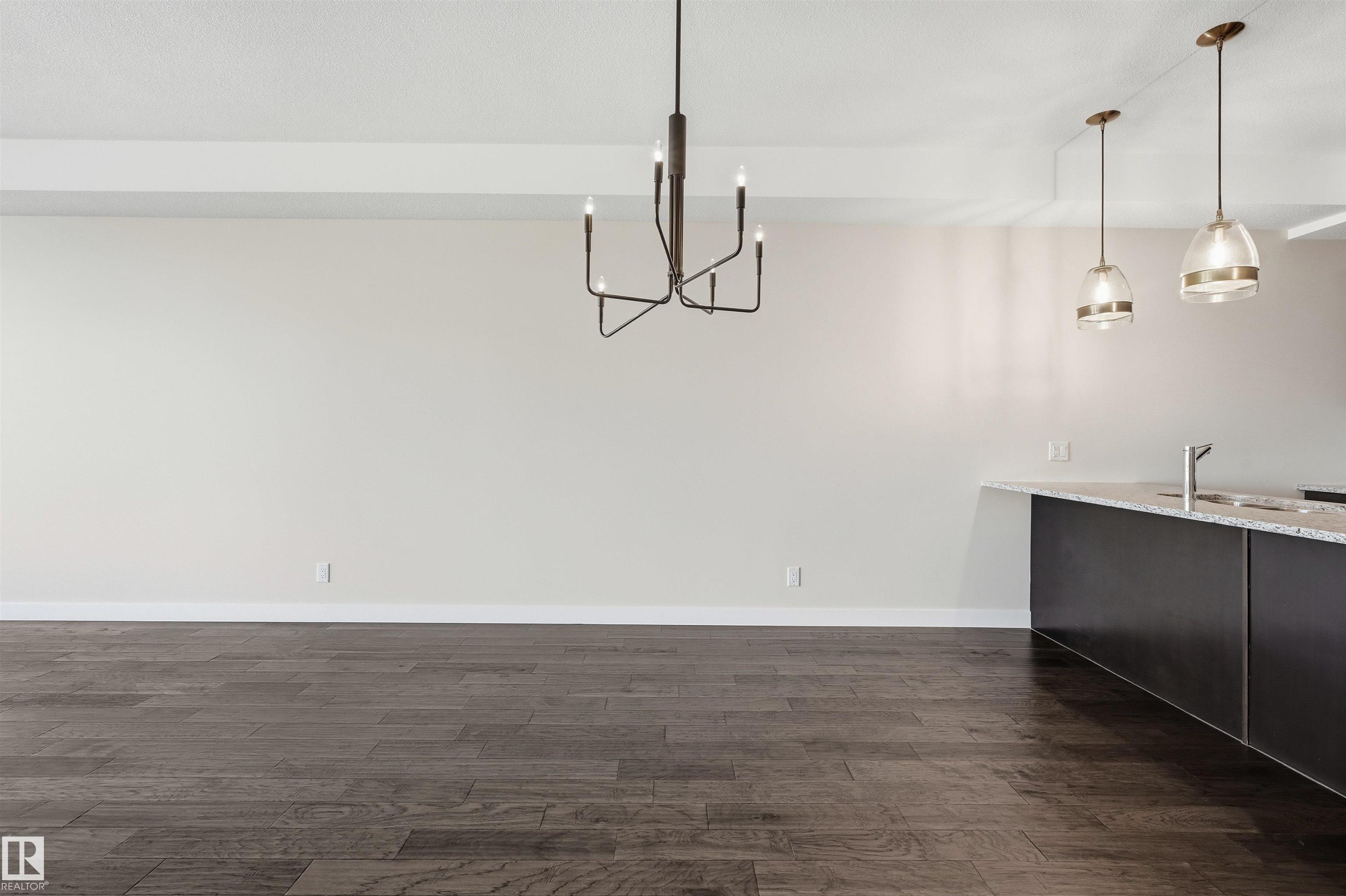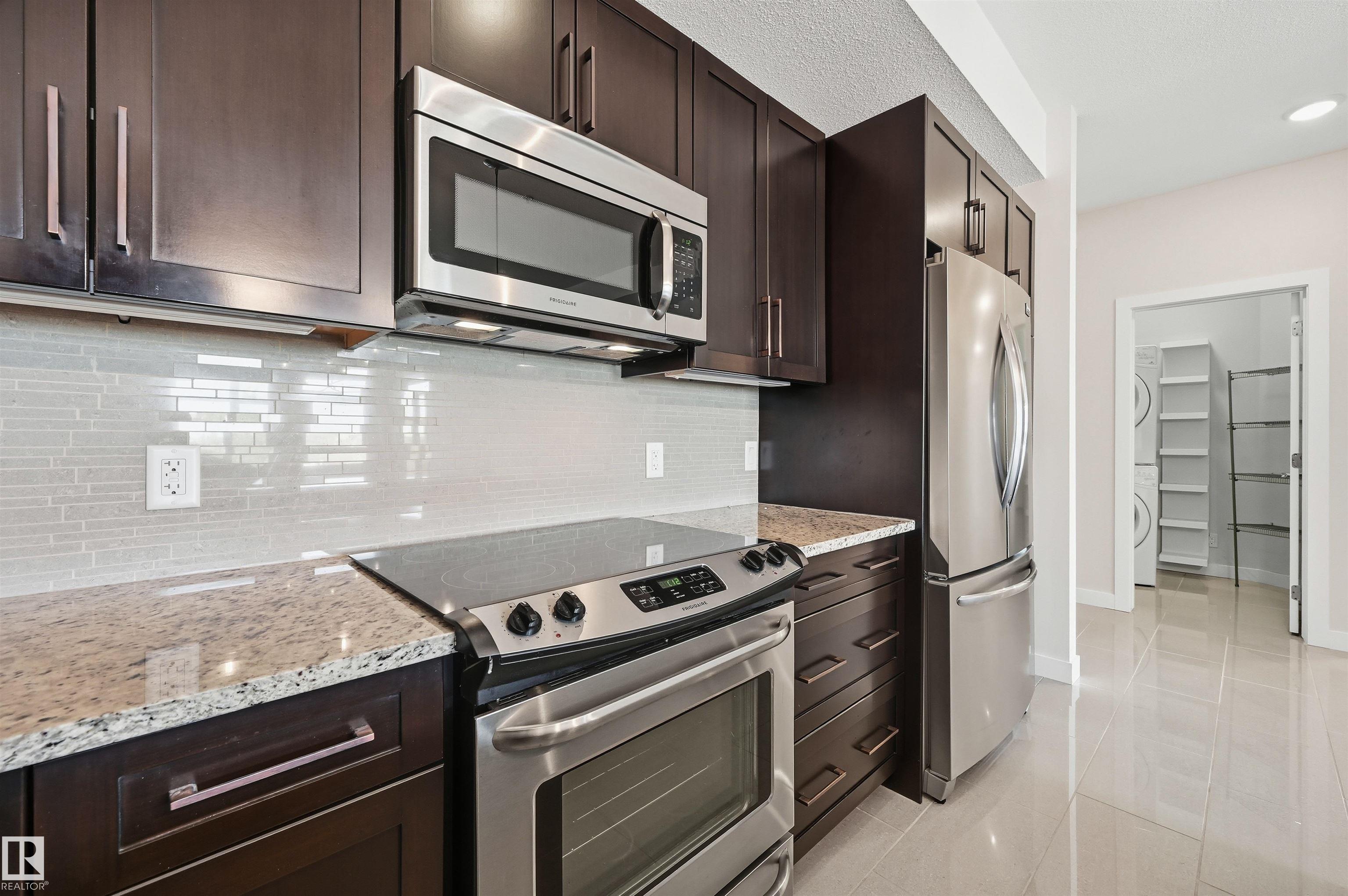 Experience luxury living at Brass III The Leger in the desirable Riverbend. This top-floor unit offers city views, showcasing craftsmanship & a well functioning floorplan. The bright, open layout features 9 ft ceilings, engineered hardwood, granite countertops, S/S appliances, maple shaker cabinets & an island w/eating bar. Living area will accommodate most furniture arrangements. Bedrooms are on opposite ends for privacy. The spacious primary suite includes a walk-in closet w/built-ins and a 4pc ensuite w/soaker tub & glass shower. 2nd bedroom for guest stays or home office/hobby studio. 3pc bathroom w/matching finishing palette. Enjoy the balcony for evening bbqs, central A/C, in-suite laundry. Double tandem underground parking stalls w/storage. Well managed complex w/healthy reserve fund. Pet-friendly & ideally located near Terwillegar Rec Centre, schools, parks & all servicing amenities. This residence combines elegance, comfort & convenience in one of Edmonton?s most sought-after communities.