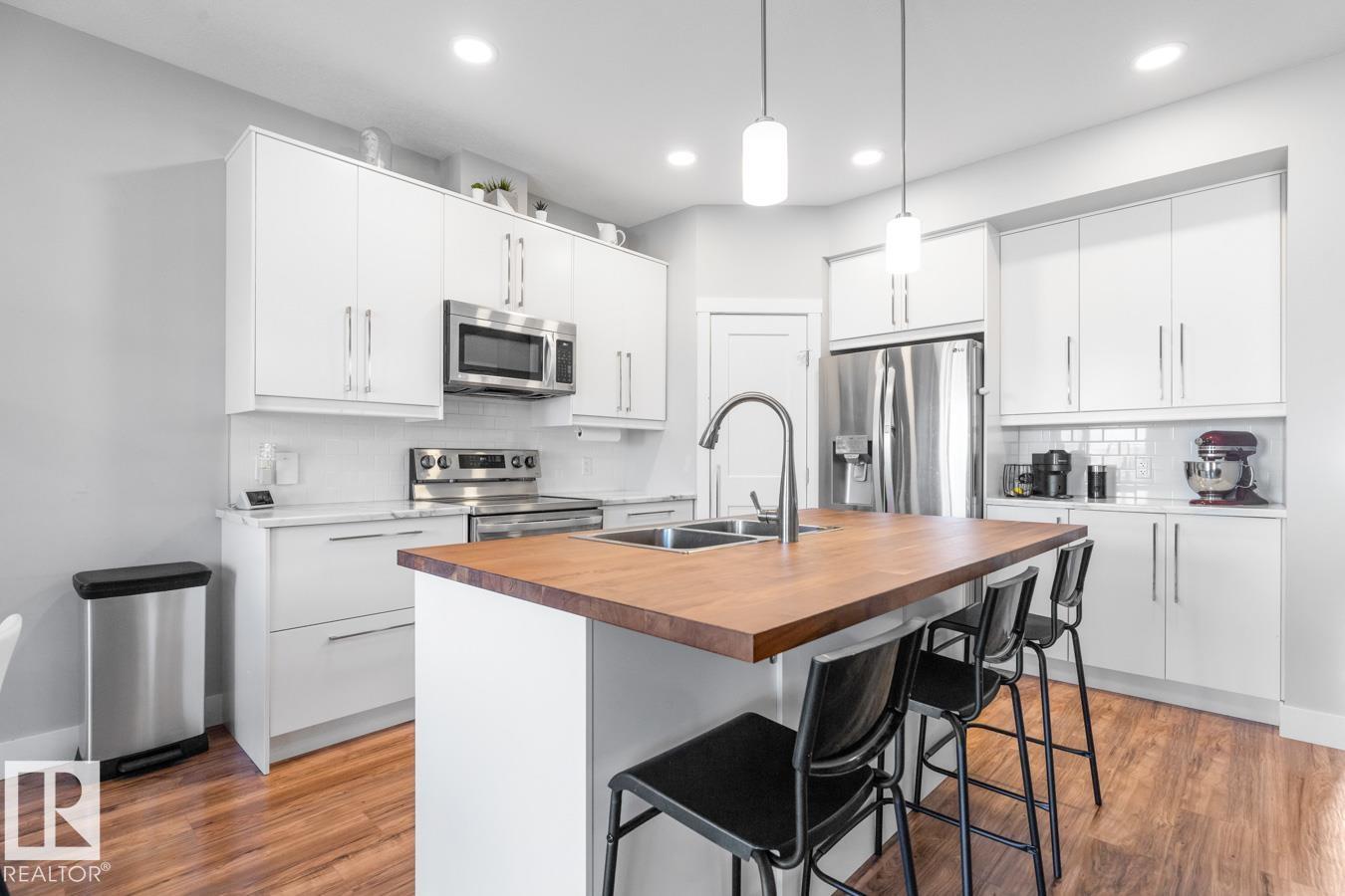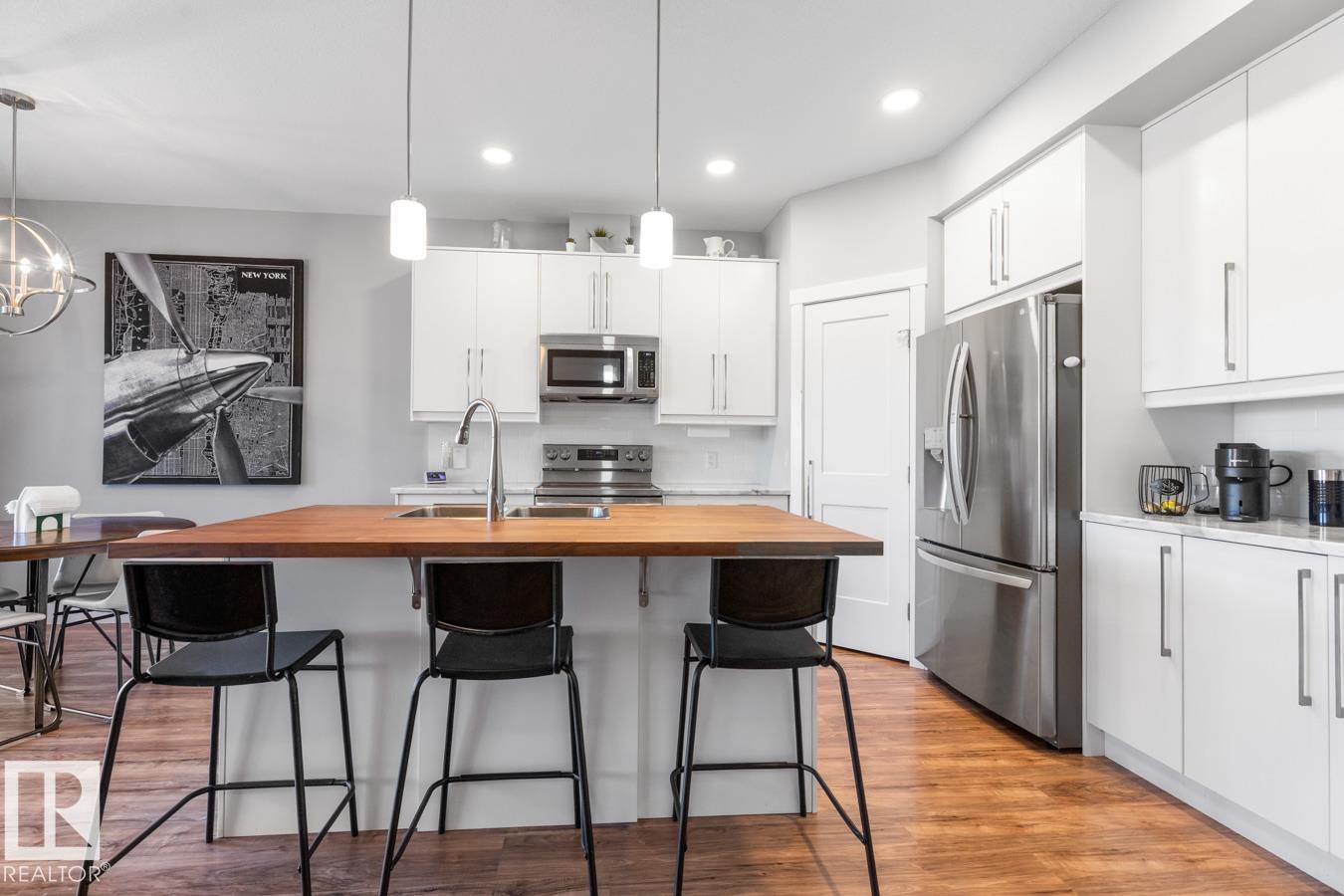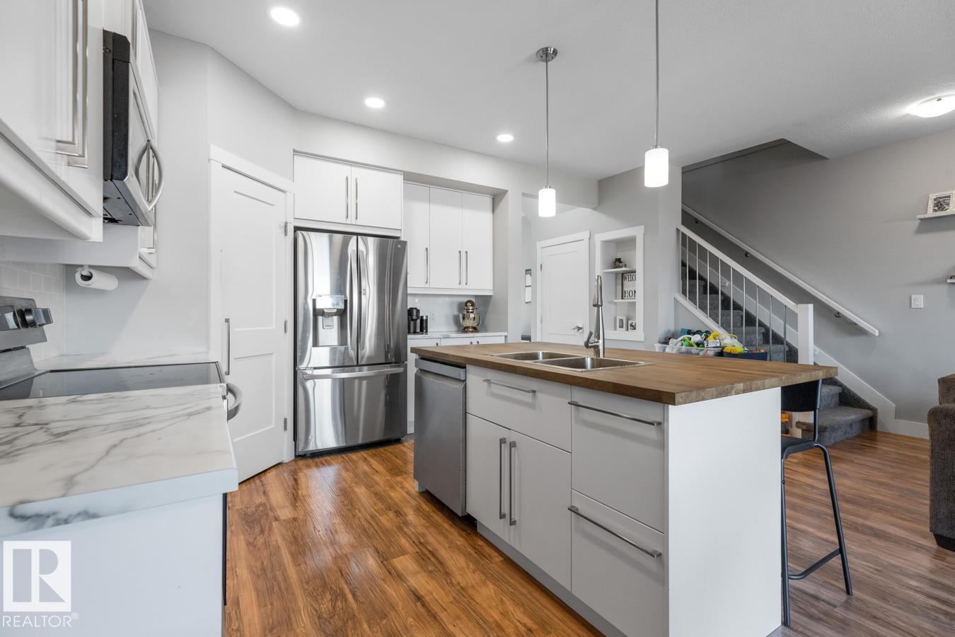 Welcome to this beautifully designed end-unit townhouse, built in 2019 & offering modern comfort across 2 spacious storeys. This home features 3 bedrooms and 3 bathrooms, including a bright primary suite w/3 feature windows, a generous walk-in closet & a 5-pce ensuite w/ dual sinks and not forgetting the convenience of an upper flr. laundry closet! Main flr. boasts a large contemporary kitchen with a stunning island featuring a butcher's block countertop and complete w/ stainless steel appliances, flowing seamlessly into the living space. Ceramic tile accents the entry hall and bathrooms, while the main & upper flr. laid w/ laminate & plush carpet on stairs. Upstairs, enjoy the convenience of a laundry closet w/ washer & dryer. The partly finished basement includes completed walls & ceilings, ready for your finishing touches. Step outside to a private deck w/privacy screen, fully enclosed by a 6-ft wooden fence. Complete with a single attached garage, this home blends style, function, and privacy.