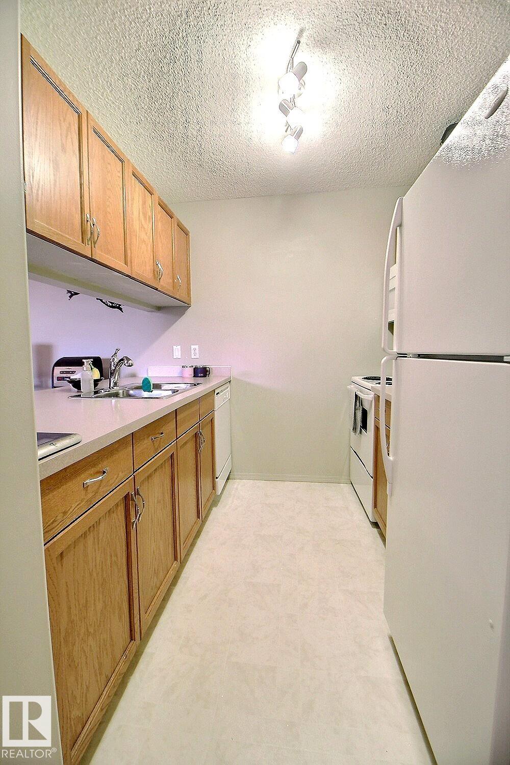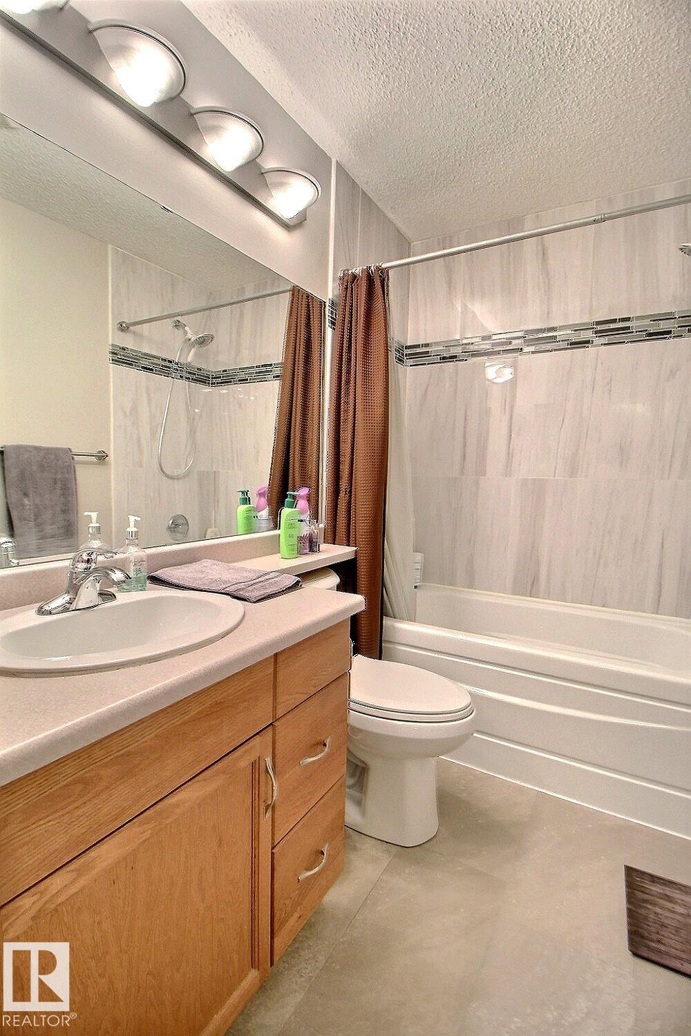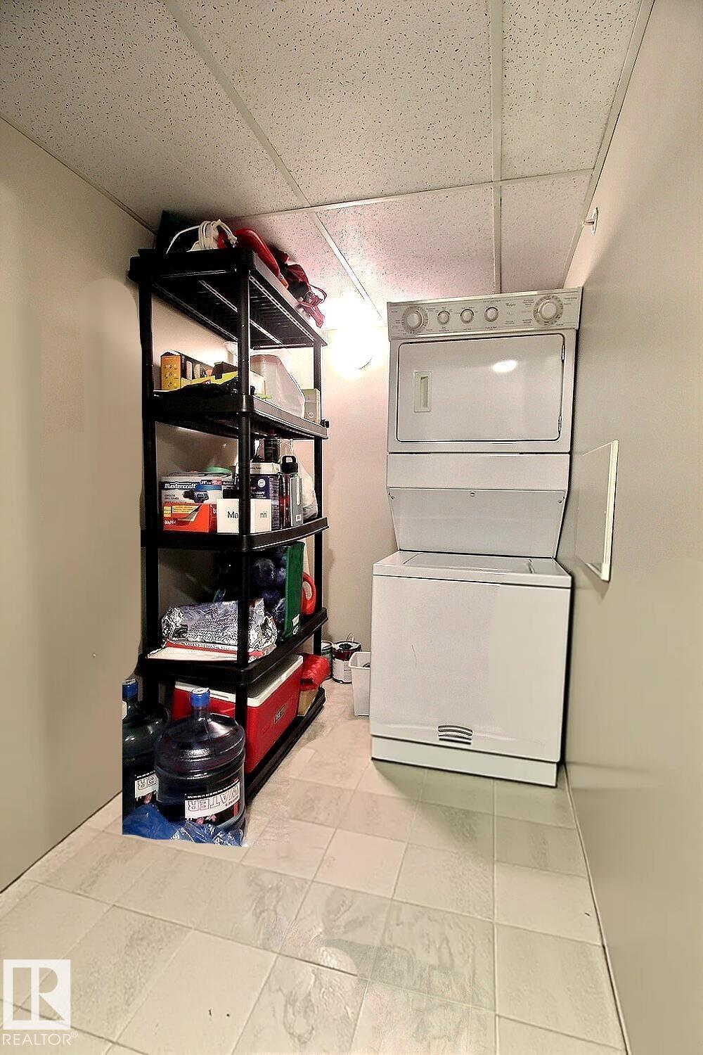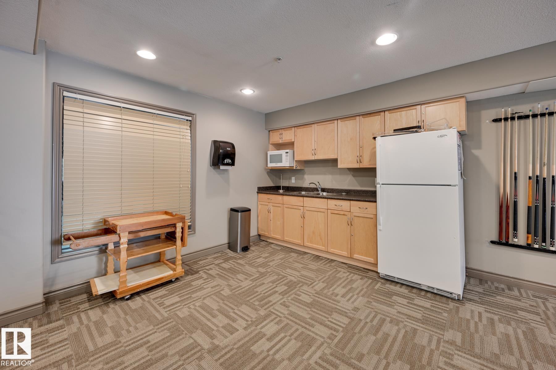 Welcome to Lewis Estates Grande! Beautiful top-floor condo with an excellent layout featuring a spacious living and dining area. Recent upgrades include a fully renovated bathroom with new tub, toilet, flooring and tile surround, plus fresh paint throughout. Enjoy central A/C, a cozy gas fireplace, in-suite laundry, and a generous private deck with BBQ gas line. This well-maintained complex offers great amenities including a gym, library, putting green, party room, guest suite, and underground parking with storage. The titled parking stall is included. Quietly located next to Lewis Estates Golf Course with easy access to walking trails, shopping, transit and Whitemud Freeway.