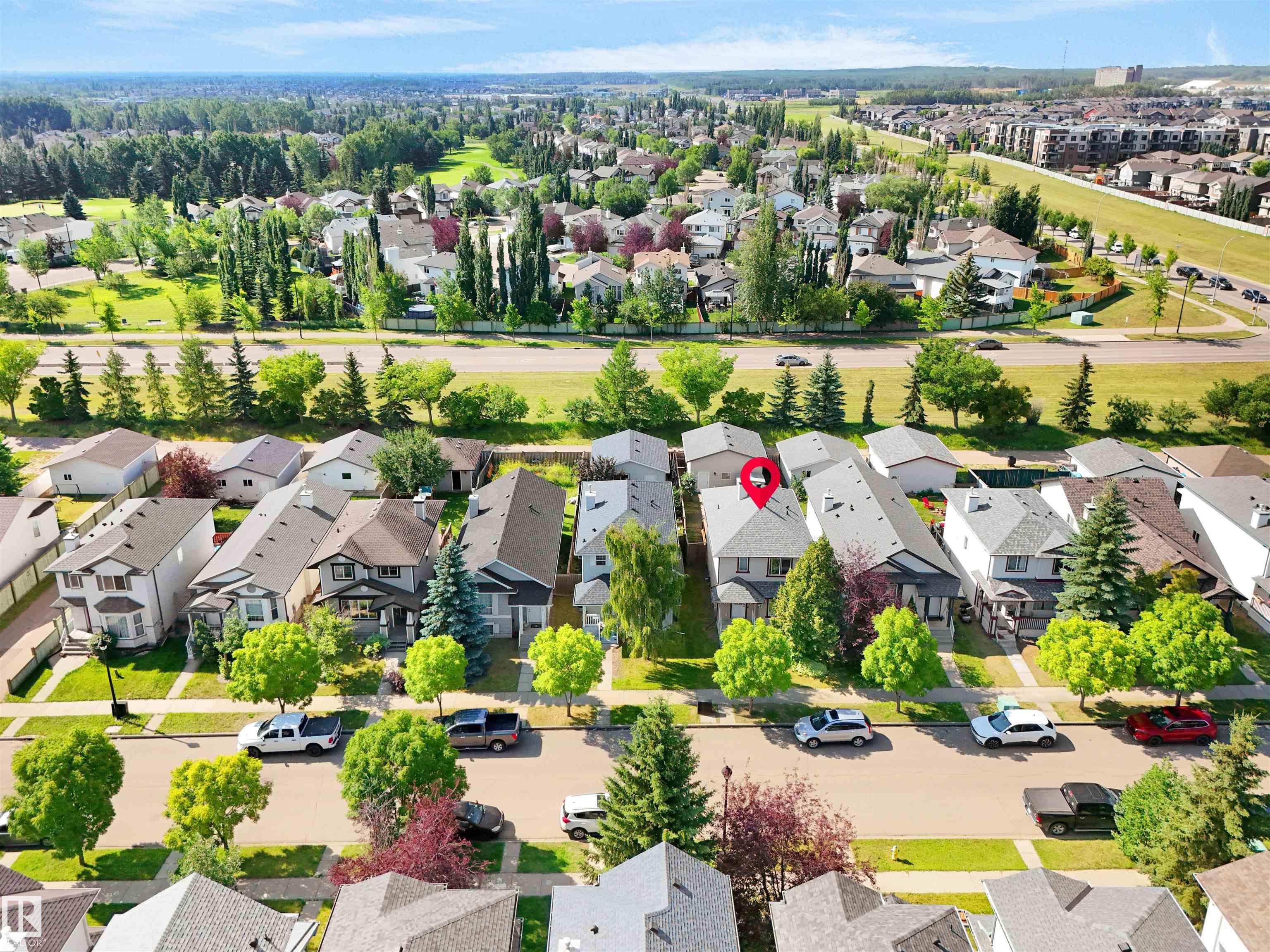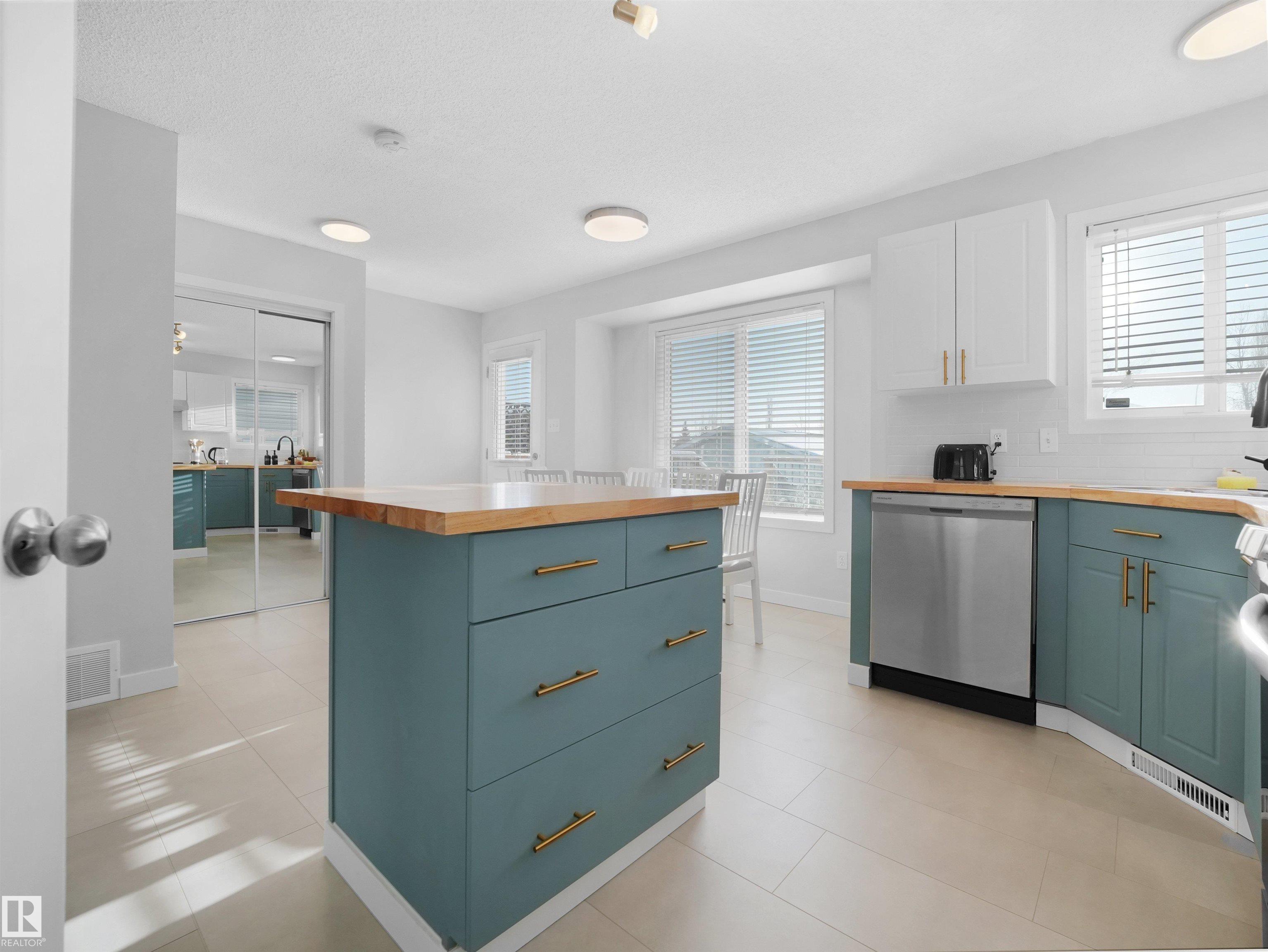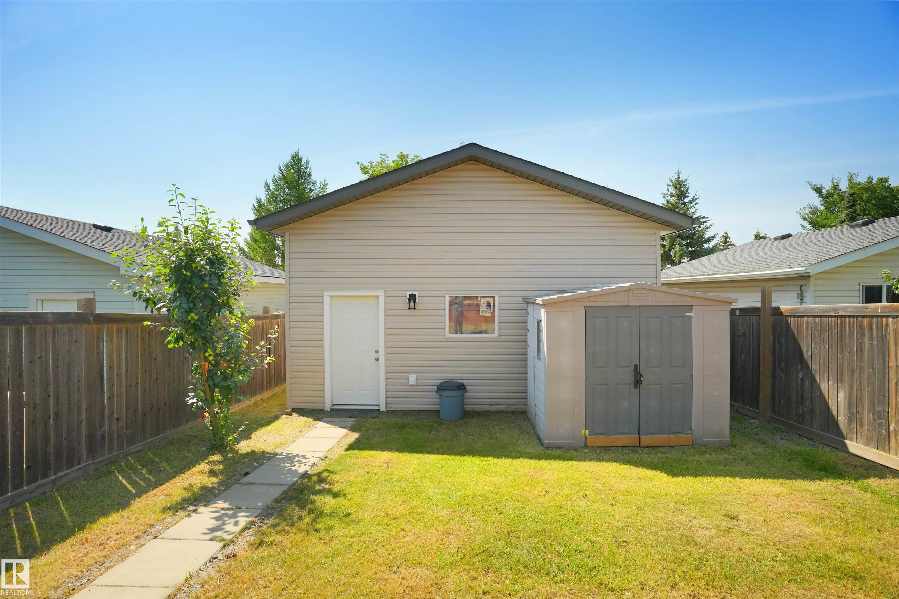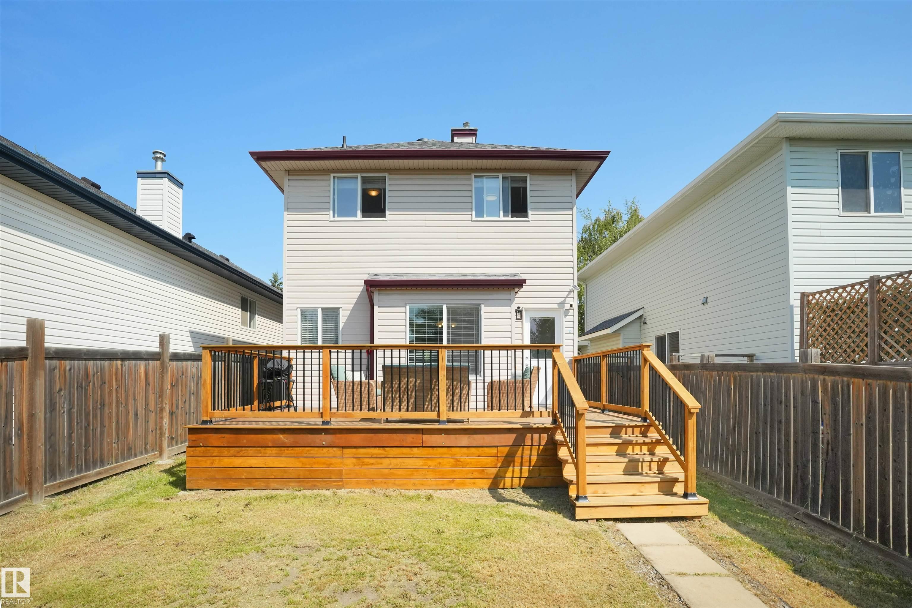 Welcome to Suder Greens?perfect for buyers seeking a quiet, established location with everyday convenience. Tucked into a cul-de-sac, this updated 2-storey offers 1,351 sq ft of move-in ready living.Freshly painted throughout (Fall 2023), including the kitchen, with new baseboards and a newer roof (2021), key updates are already done. The refreshed kitchen features a new stove, hood fan, and updated finishes, opening into a bright dining area with oversized windows that fill the space with natural light. New flooring in the kitchen, bathrooms, and front entry adds a clean, modern, low-maintenance feel.Upstairs offers 3 well-sized bedrooms and a full 4-piece bath.Enjoy a south-facing backyard backing onto a greenbelt?rare privacy in this price range?with a large patio for summer use. Oversized, extra-height garage.Walk to parks, golf, and schools. Quick access to West Edmonton Mall and Anthony Henday Drive.